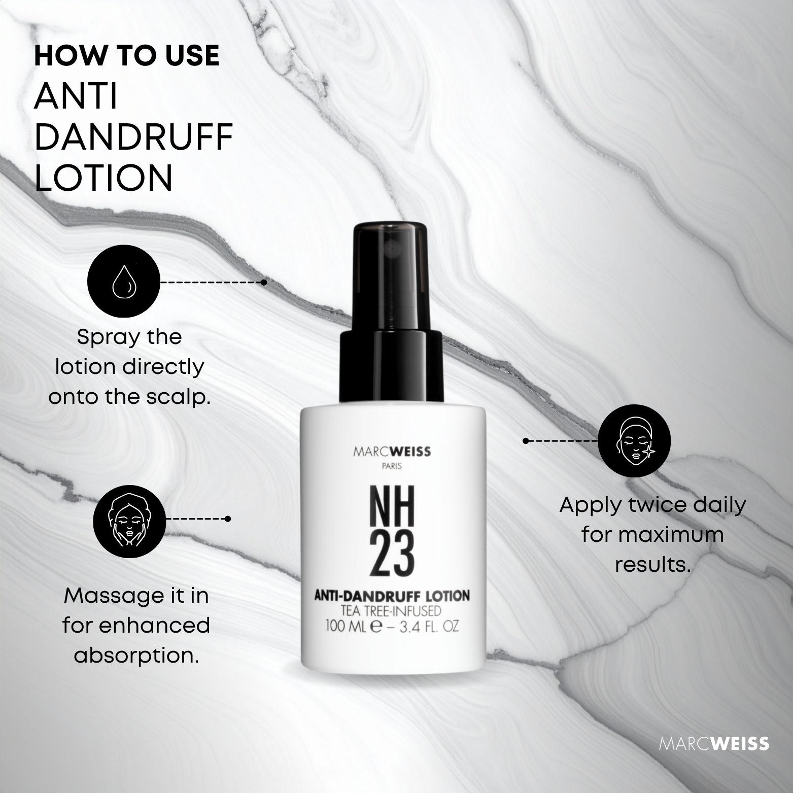 Application: To achieve the best results, start by washing your hair with Marc Weiss Anti-Dandruff Shampoo to cleanse the scalp and remove impurities. Once your hair is clean, apply a small amount of NH23 Anti-Dandruff Lotion directly to the scalp, gently massaging it into problem areas to ensure even distribution. Allow the lotion to absorb for a few minutes, letting the active ingredients deeply nourish and soothe the scalp. There’s no need to rinse—simply style your hair as usual and enjoy the long-lasting refreshing sensation and flake-free hair throughout the day.