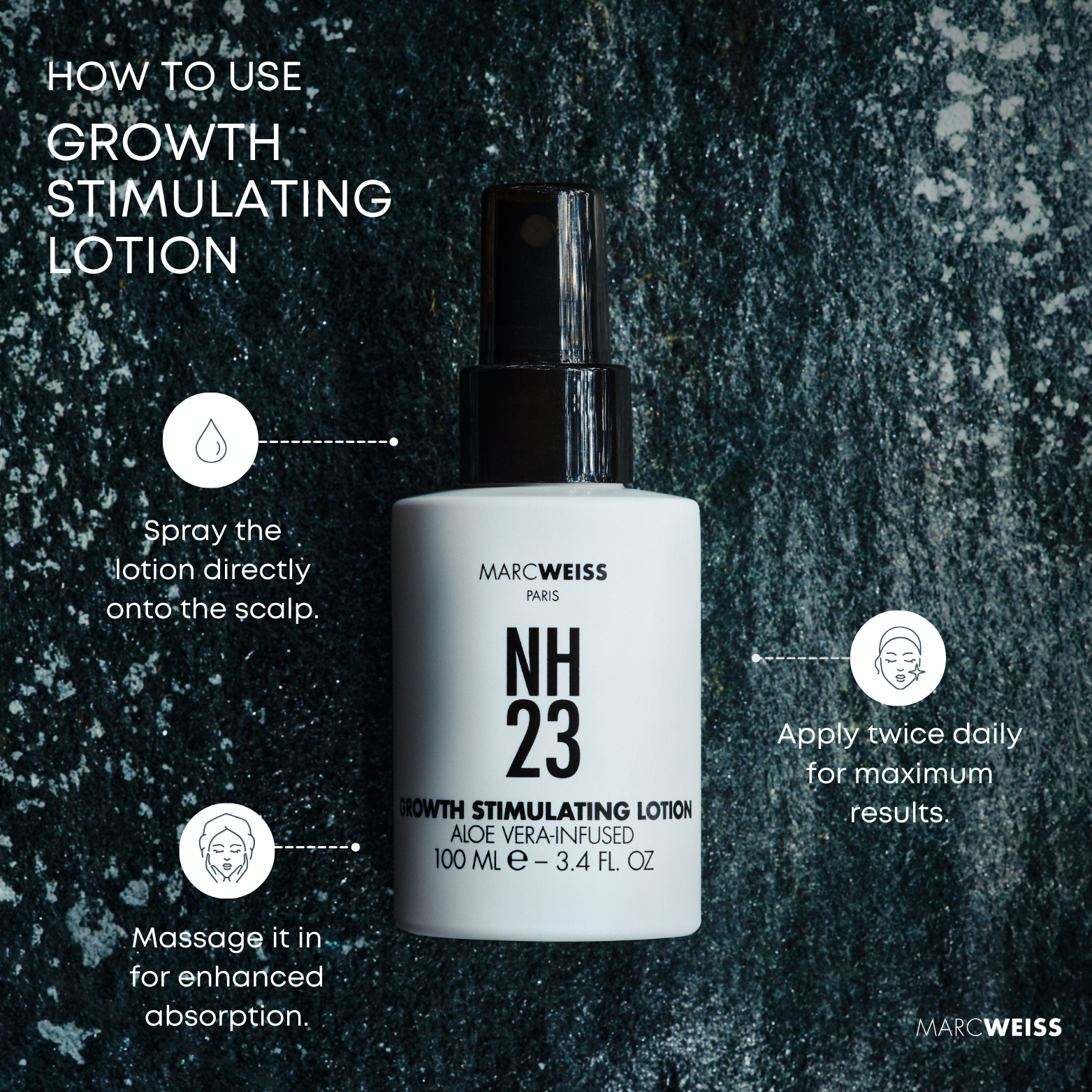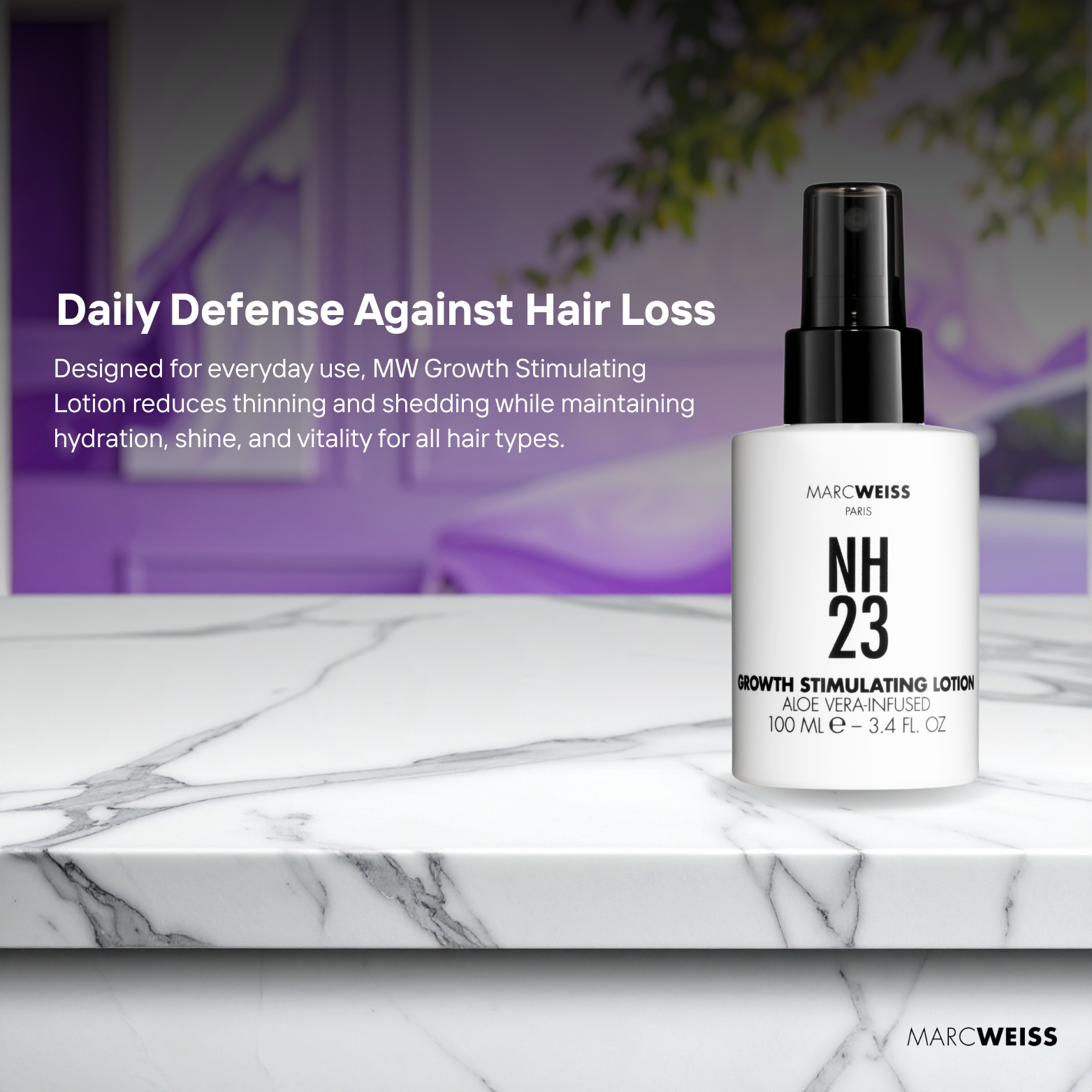 Application: For best results, wash your hair with Marc Weiss Growth Stimulating Shampoo, rinse thoroughly, and towel dry. Spray the lotion directly onto the scalp, massage it in, and use the MW Scalp Brush for enhanced absorption. To maximize long-lasting results, apply twice daily and experience the transformation of stronger, fuller, and healthier hair.
