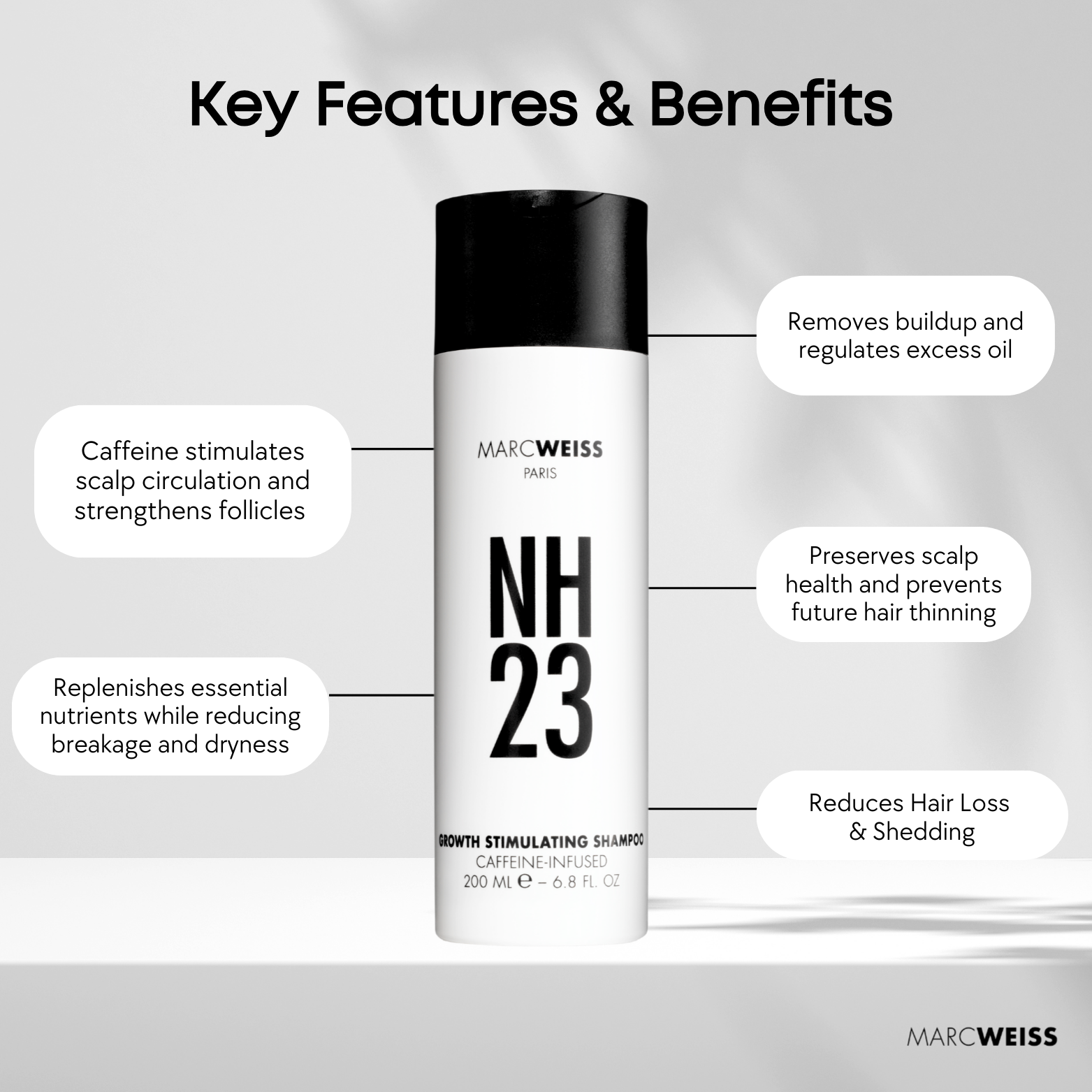 Application: For best results, apply NH23 Growth Stimulating Shampoo to wet hair, emulsify it into a rich lather, and massage it into the scalp using the MW Scalp Brush to stimulate circulation and enhance absorption. Rinse thoroughly and repeat if necessary to experience a stronger, fuller, and healthier head of hair.